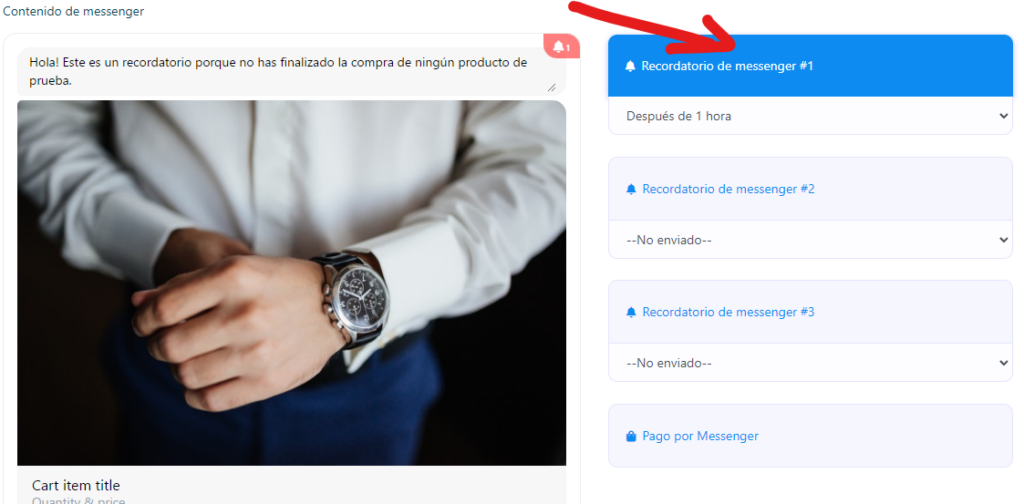 En este apartado podrá configurar los mensajes que se enviarán cuando el usuario efectúe una compra o los recordatorios cuando haya agregado un producto al carrito, pero no haya finalizado la compra.
